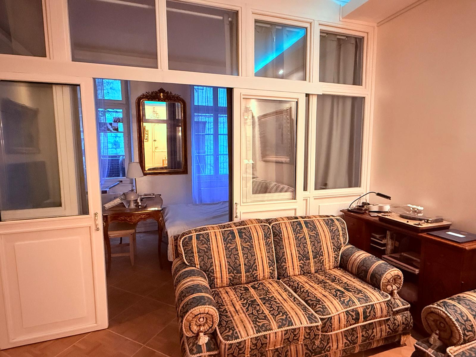 Renovated with elegance, the apartment blends traditional charm with modern comfort. It features a sitting room, a bedroom, a bathroom with a bathtub, and an equipped kitchen. A laundry room and cellar are available on the lower ground floor.